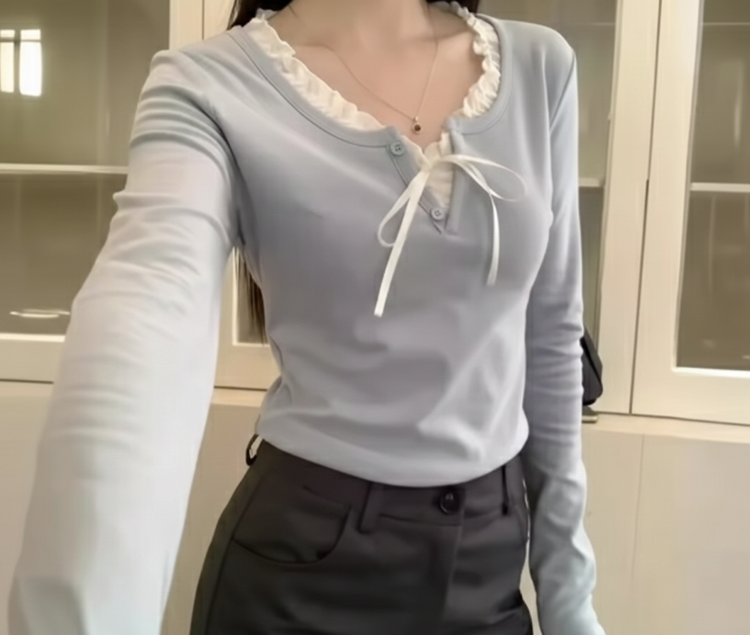 Eleva il tuo look quotidiano con questa t-shirt dal design unico. Caratterizzata da un raffinato dettaglio patchwork e un fiocco frontale, questa maglia unisce il comfort dell'autunno allo stile chic coreano. Perfetta per chi cerca un capo versatile, morbido al tatto e facile da abbinare.